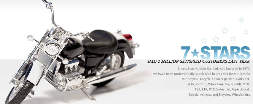 Established on 1st. Nov. 1972. Seven Stars has specialized in tires and innertubes for bicycles, wheelchairs, motocycles, and later in industrial agricultural vehicles, such as wheelbarrows, lawn & garden and in trailers,and today for go kart, golf cart, forklift,OTR, TBR, PCR,… as you can browse our websites www.7-stars.com.tw and http://sevenstars.taiwantrade.com.tw of wide ranged products, which are originated in Vietnam and China factories by our Taiwanese high and stable quality compound as well as advanced technology, equipments and manufacturing management.